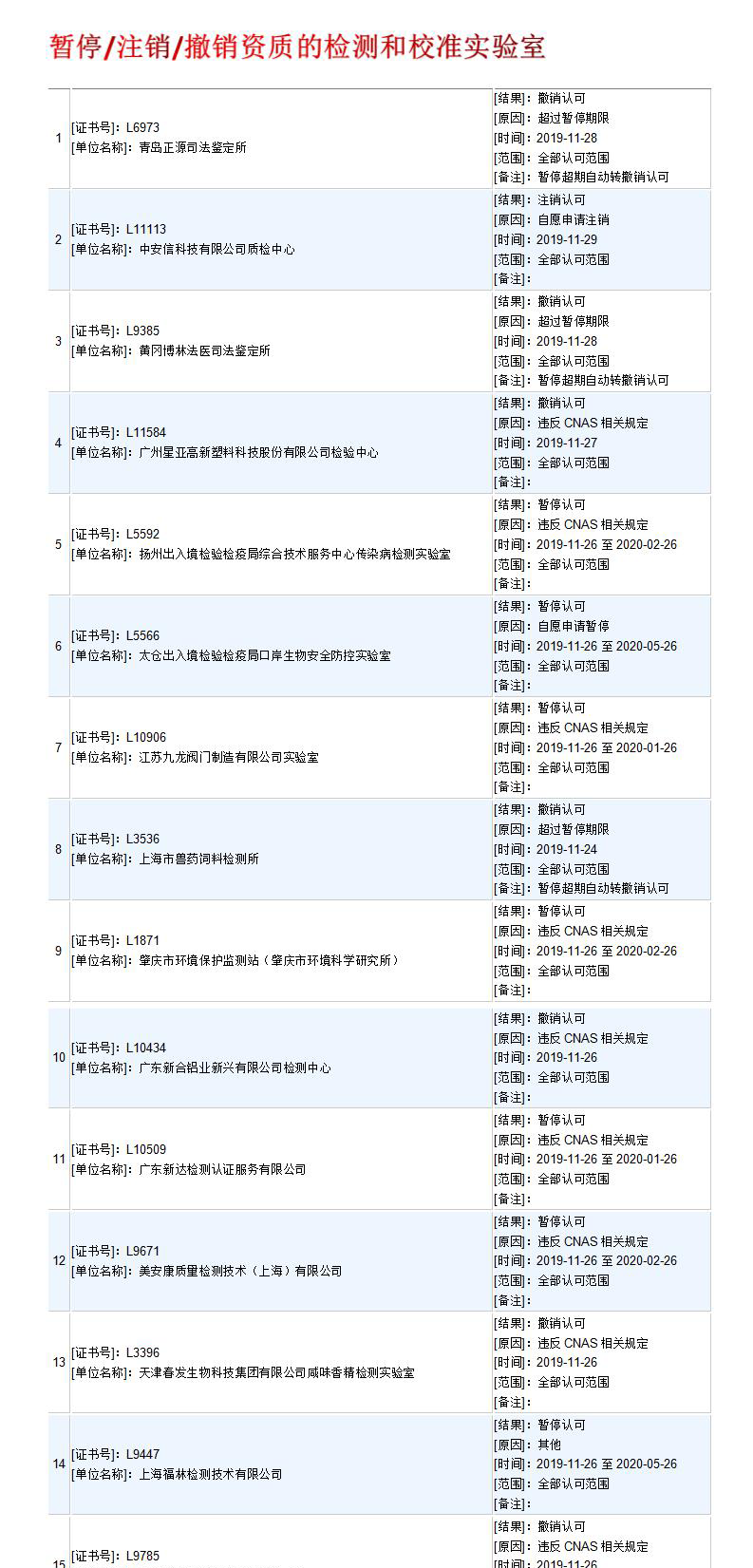 2019年11月全國共有41家檢測和校準實驗室和3家檢驗機構被暫停注銷撤銷資質